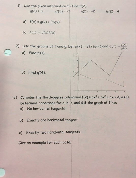 Note that since k > 0, then the constant (1/k) > 0 hence there exist a constant c > 0, namely c = (1/k), and a constant n0such that for all n ≥ n0 f(n) ≤ c*g(n) which is the definition of f(n) = O(g(n)) Problem II Analysis of Algorithms(50 points). F (x) g(x) (g(x 0) 6= 0) Die Komposition stetiger Funktionen ist wieder eine stetige Funktion Beispiel f (x;y) = sin(p x2 y2) ist auf ganz R2 stetig Reiner Lauterbach (Mathematik, UniHH) Analysis I f ur Ingenieure 129 / 190. · h'(1)=16/3 The product rule states, if h(x)=f(x)g(x), then h'(x)=f'(x)g(x)f(x)g'(x) We are ask to find h'(1), or by the product rule h'(1)=f'(1)g(1)f(1)g'(1) The values of the functions must be f(1)=2 and g(1)=4/3 Remember the derivative gives the slope of any given point, but as we can see in the figures these must correspond, to the slope of the line, which.